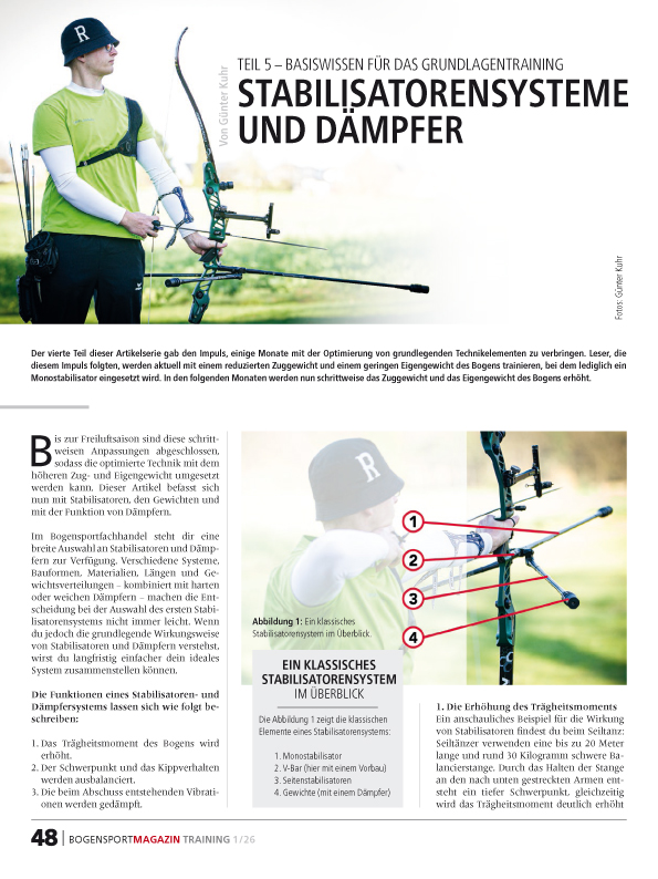 Der vierte Teil der Serie regte dazu an, mehrere Monate an grundlegenden Technikelementen zu arbeiten. Wer dem folgte, trainiert derzeit mit reduziertem Zuggewicht und leichtem Bogen mit Monostabilisator. In den kommenden Monaten werden Zug- und Bogengewicht schrittweise wieder auf höheres Trainingsniveau angehoben.