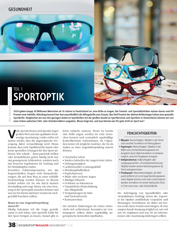 Teil 1: 2024 trugen in Deutschland rund 39 Mio. Menschen ab 16 Jahren eine Brille. Etwa 60 % nutzen sie auch bei Freizeit- und Sportaktivitäten – meist jedoch nur die Alltagsbrille. Nur etwa 5 % der aktiven Brillenträger besitzen eine Sportbrille. Das deutet auf häufige Fehl- oder Unterkorrektion im Sport hin.